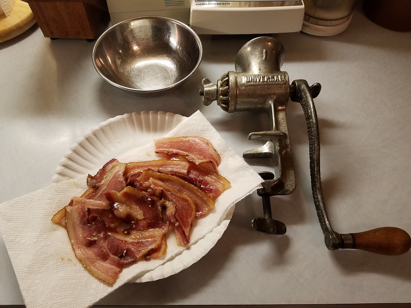 Simmer the bacon until it's cooked very soft, then grind it up (you can add this to anything you can think of).